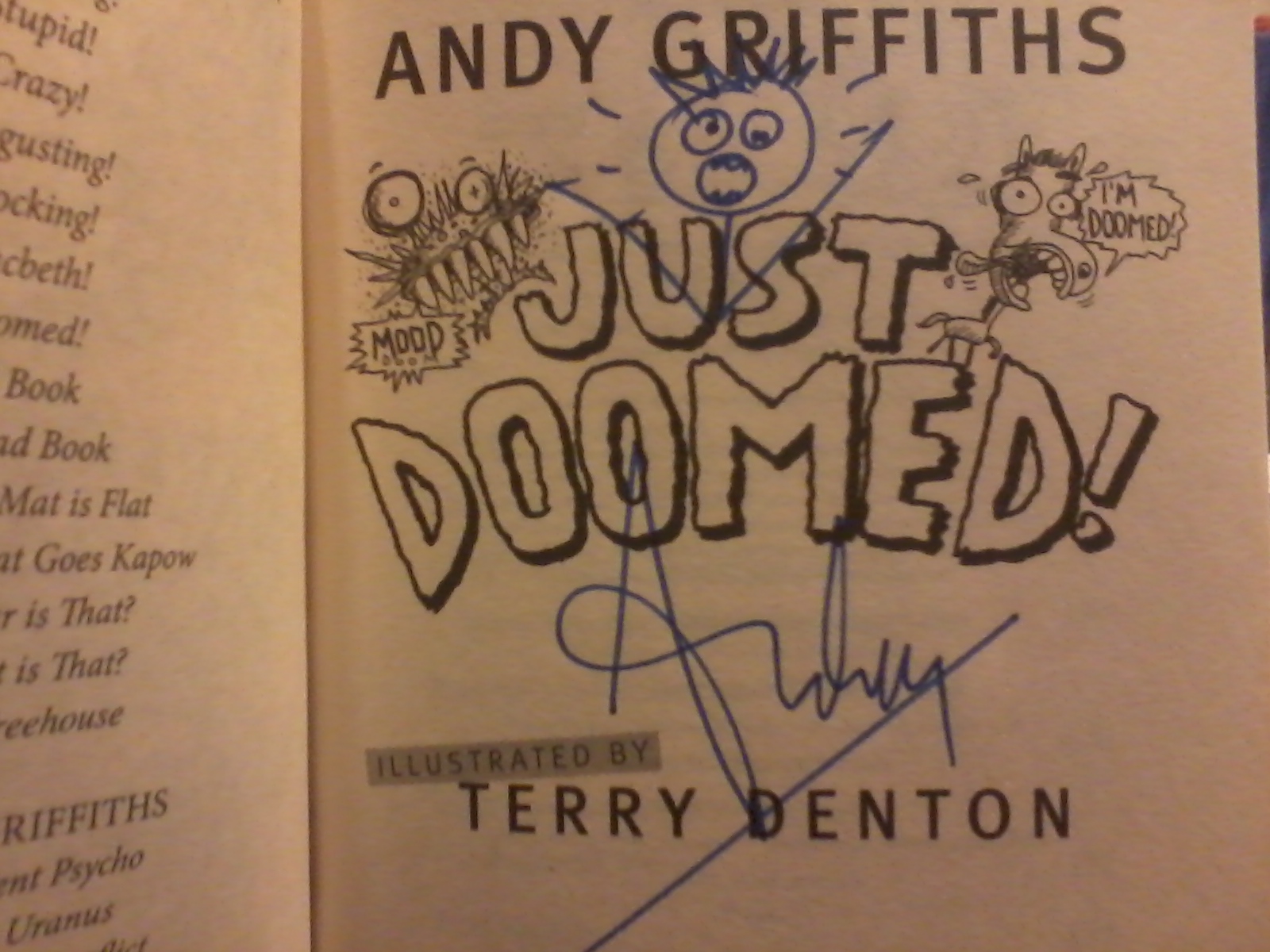 Australia’s funniest children’s author, Andy Griffiths was in Christchurch on Sunday and he visited The Children’s Bookshop to meet his fans and sign books.  I was one of the lucky people who got their books signed and I got a copy of Andy’s latest book, Just Doomed, signed to giveaway here.